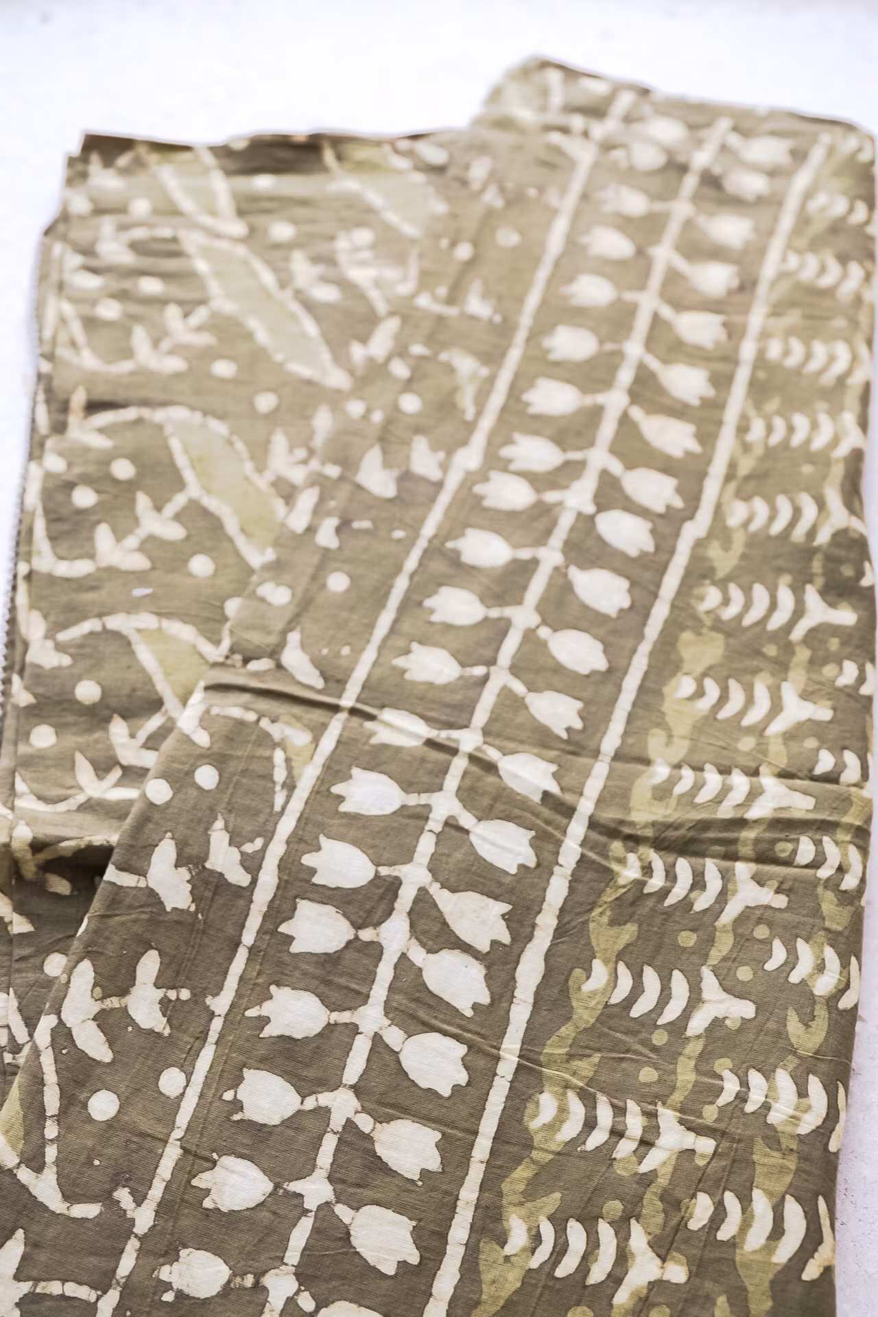 Sarongen är tillverkad i mjuk bomull, tryckt för hand med traditionell blockteknik. Varje tygstycke är unikt, skapat med naturliga, växtbaserade färger och ett hantverk som förts vidare genom generationer.