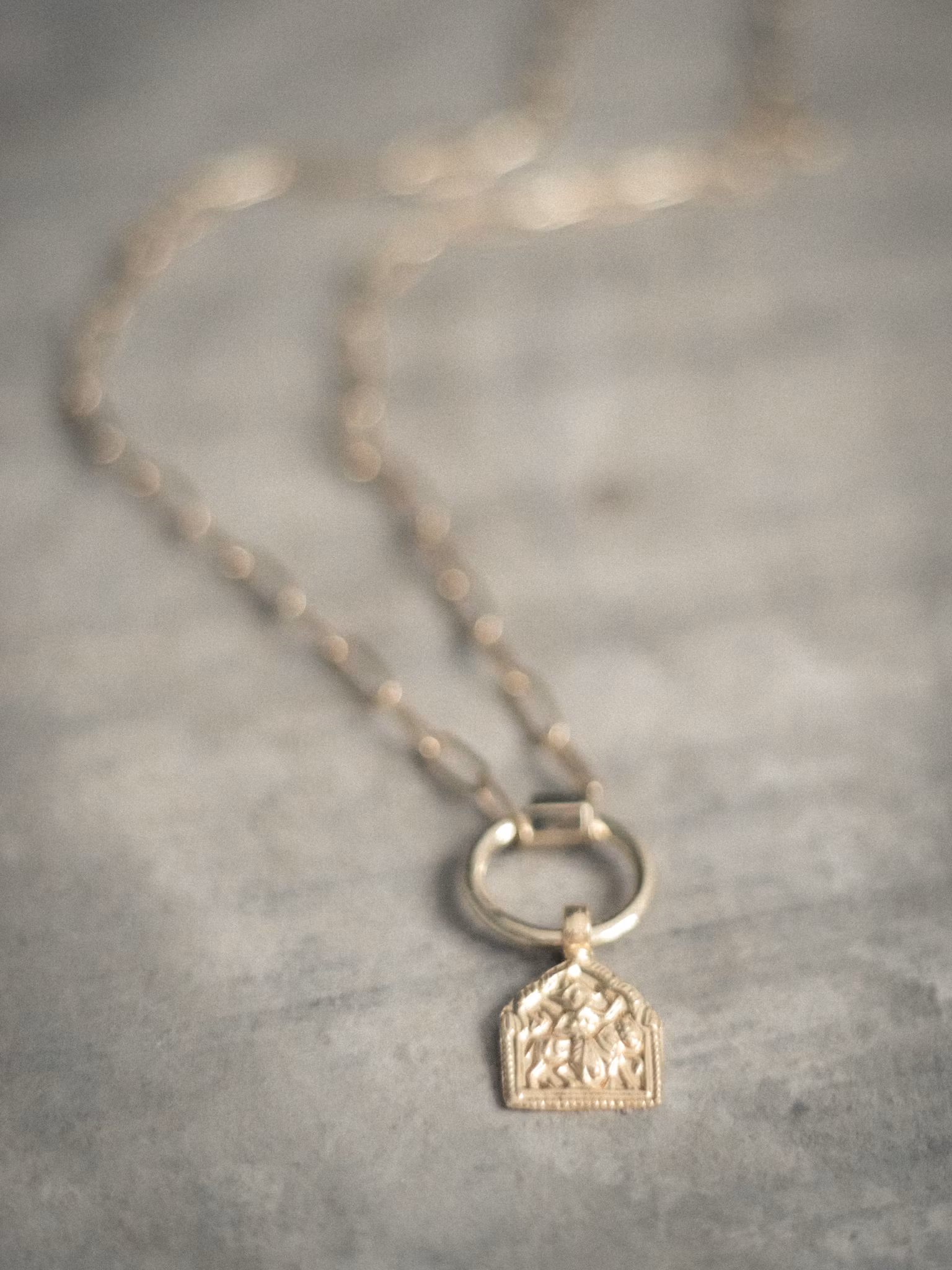 Halsbandet bär en amulett inspirerad av Bhumiya Raj – jordens väktare och beskyddare i indisk folklig tradition. En symbol för förankring, kraft och inre trygghet, skapad för att följa dig genom vardagen som en stilla påminnelse om din egen styrka.