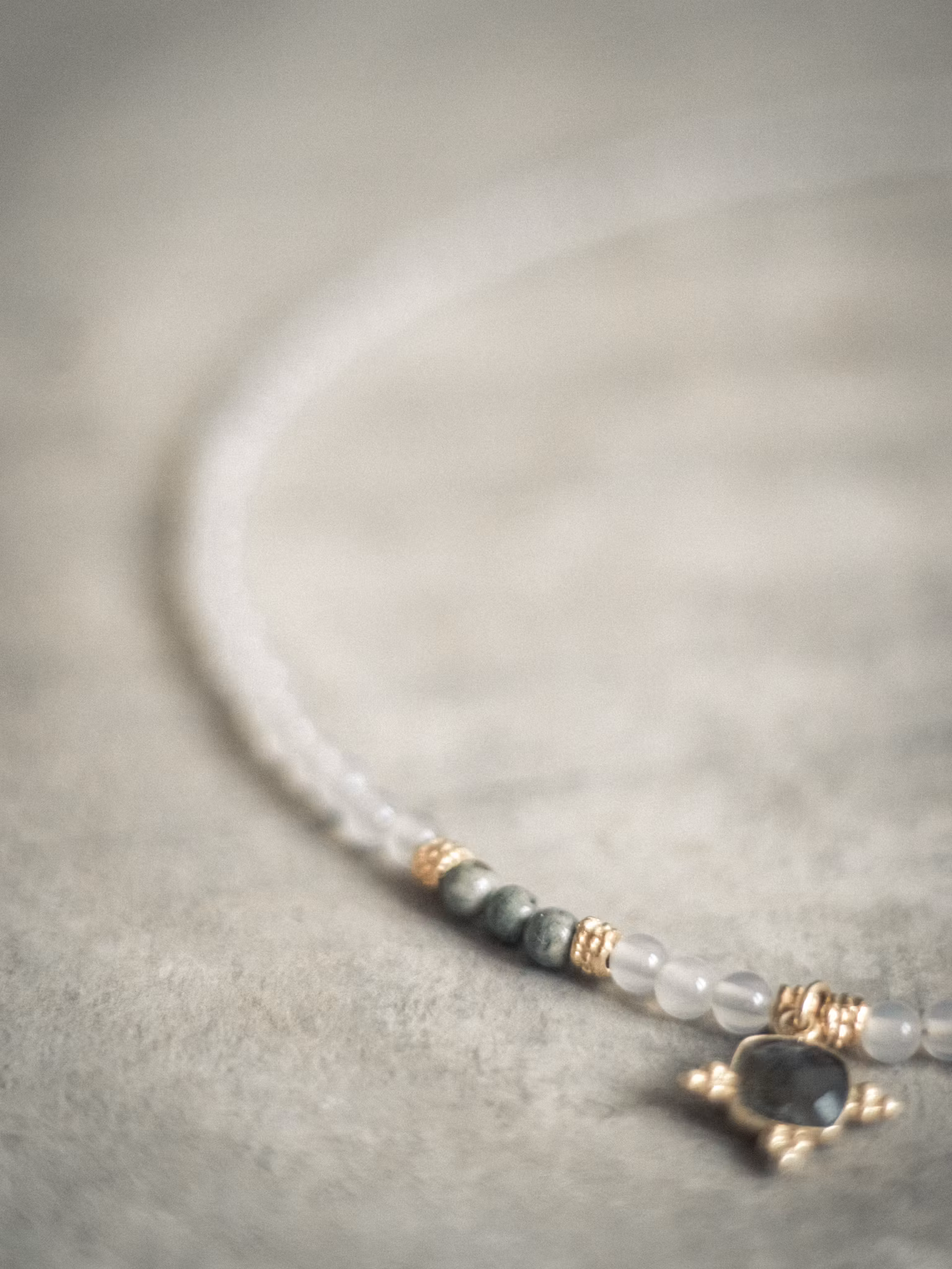 Tillsammans skapar stenarna ett halsband som bär en känsla av klarhet, mjuk styrka och hjärtats visdom.
