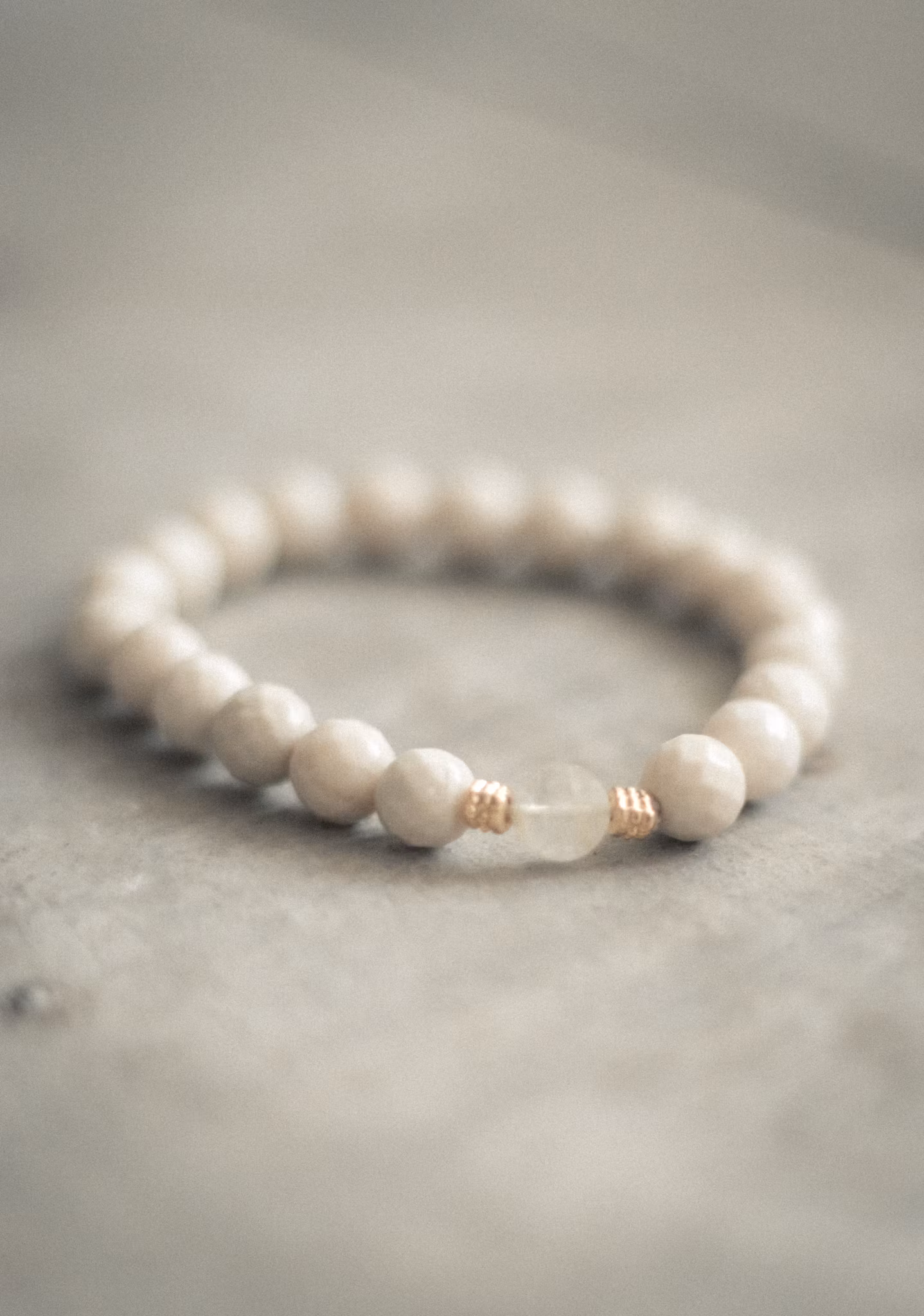 Riverstone för med sig känslan av rörelse och förändring – en påminnelse om att allt i livet är i ständig rörelse, precis som vattnets flöde. Den bär en mjuk men stadig energi som stöttar dig i att släppa taget om det gamla och följa med i livets rytm. Rutilkvarts är stenen som fångar ljuset. Med sina gyllene trådar sägs den bära klarhet, inspiration och en stark länk till inre vägledning. Den förstärker intentioner och hjälper dig se nya vägar framåt. Tillsammans skapar de en kombination av jordande flöde och upplyftande klarhet – ett armband som både bär dig genom förändring och öppnar för nya möjligheter.