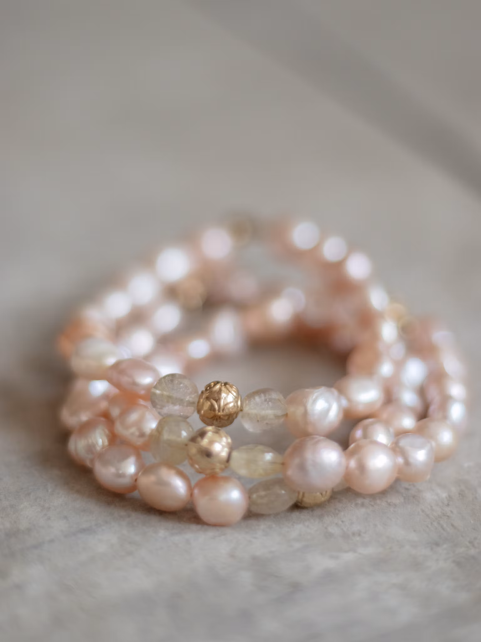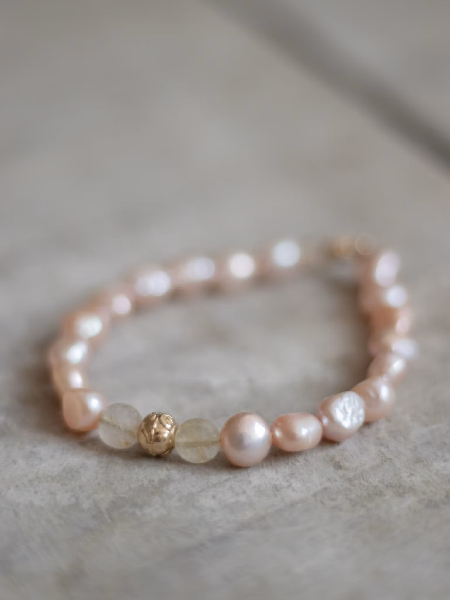 Armband skapat av 8–9 mm högkvalitativa sötvattenspärlor, rutilkvarts och detalj i 24k guldplätering. Finns i tre längder.